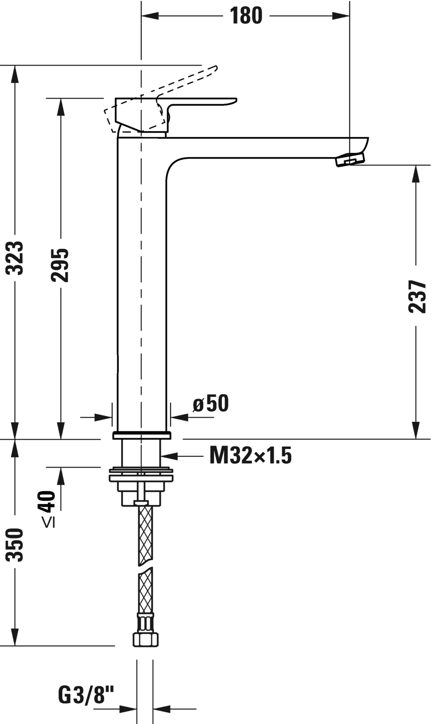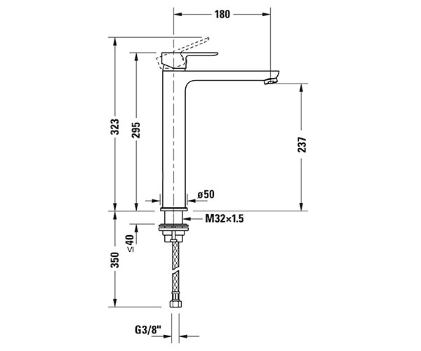 陶瓷混合系统, 伸出长度 180 mm, 连接软管 3/8", 标准喷雾, 表面镀铬, 温度范围可调节, 推荐在压力 3-5 bar下进行操作, 不带下水器套装, 295 mm